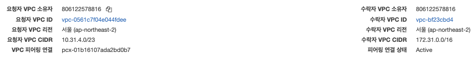 - 서울리전의 'VPC > 피어링 연결'에서 요청 수락